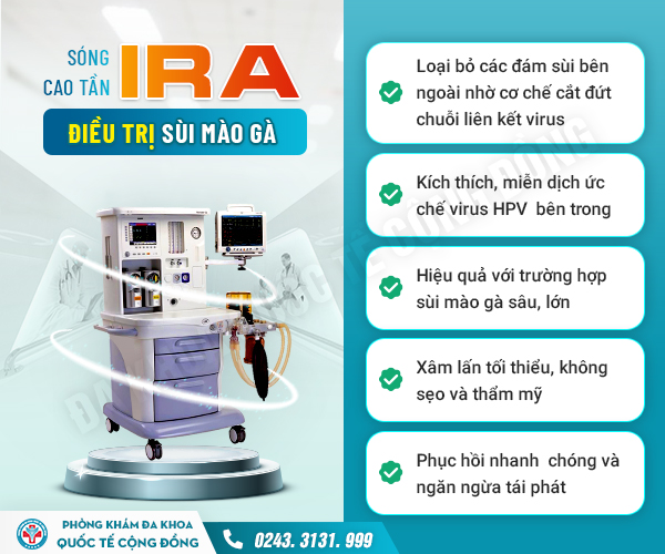 Không sử dụng các phương pháp đốt sùi truyền thống (điện, laser, áp lạnh) như tại các y tế cơ sở địa phương mà hiện nay tại các cơ sở y tế chuyên khoa lớn như phòng khám Đa Khoa Quốc Tế Cộng Đồng đã ứng dụng công nghệ IRA trong việc điều trị sùi mào gà.