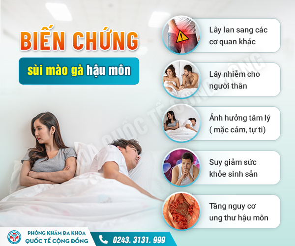 Sùi mào gà hậu môn là một bệnh lý nguy hiểm có nguy cơ gây biến chứng ung thư. Hãy thăm khám kịp thời tại các cơ sở uy tín như Phòng khám Đa Khoa Quốc Tế Cộng Đồng nếu có bất kỳ dấu hiệu nghi ngờ nào. Bạn có thể chat nhanh [TẠI ĐÂY] hoặc liên hệ hotline 19001021 nếu cần tư vấn thêm bất kỳ thông tin nào. Tổng đài hỗ trợ 24/7, hoàn toàn miễn phí, sẵn sàng giải đáp mọi thắc mắc nhanh chóng, tận tình mỗi ngày!