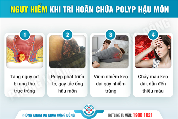 Trong trường hợp không điều trị, điều trị muộn, tự ý dùng thuốc tại nhà hoặc điều trị không đúng cách, polyp hậu môn có thể phát triển kích thước, tăng số lượng, gây chảy máu kéo dài, đau rát, nhiễm trùng. Đặc biệt, một số polyp nếu để lâu ngày không được loại bỏ có thể có nguy cơ chuyển hóa thành ung thư hậu môn – trực tràng, đe dọa nghiêm trọng đến tính mạng người bệnh: