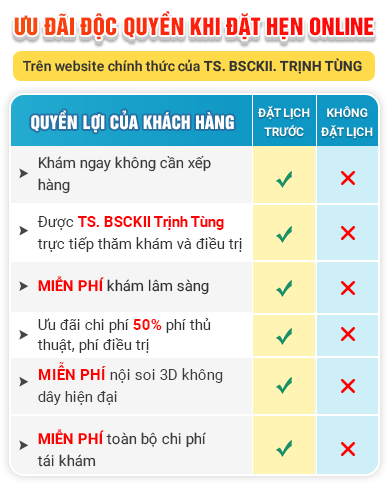 Bệnh nhân đến Phòng khám bác sĩ Trịnh Tùng muốn nhận ưu đãi về chi phí vui lòng đặt lịch hẹn khám trước [TẠI ĐÂY] sẽ được hưởng nhiều ưu đãi hấp dẫn.